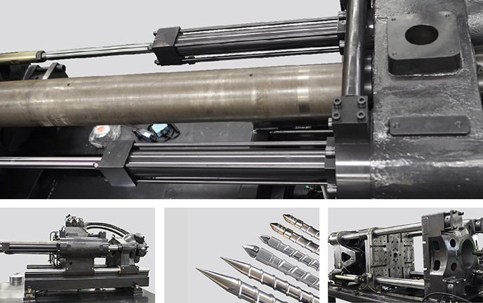 注射單元采用模組化的托板座設計,一線式雙缸平衡注射裝置,使螺桿在注塑過程中受力均勻,顯著提高射膠穩定性,使料筒定位更加準確 高剛性的寬模板設計,配合高安全系數的拉桿,整體提升合模結構的剛性及穩定性